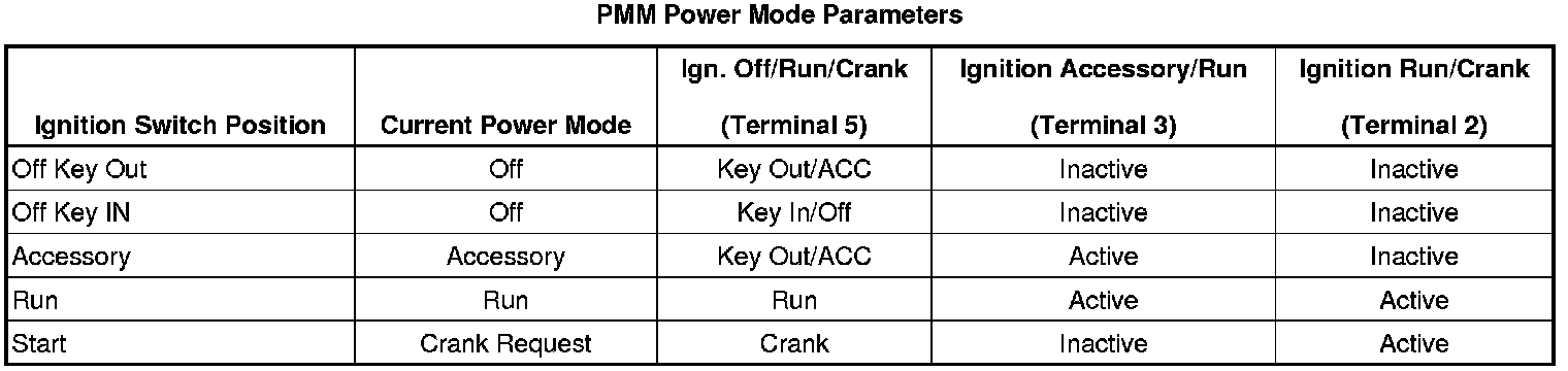 The vehicle power mode master (PMM) is the body control module (BCM). The ignition switch is a low current switch with multiple discrete ignition switch signals to the PMM for determination of the power mode. The PMM receives the ignition switch signals, and additionally a reference voltage signal from the BCM, through the ignition switch, and back to the BCM. There are redundancies within the PMM system that can allow operation of certain subsystems when there are faults in the ignition switch circuits. Other information such as serial data input from other modules and DTCs is also used to determine what power mode signals and information is transmitted by the PMM. The BCM logic uses all this information to identify the operator's desired power mode and activate specific discrete signals, and serial data messages for the operation of different subsystems as necessary. Other modules which have switched voltage inputs may operate in a default mode if the PMM serial data message does not match what the individual module can detect from its own connections.