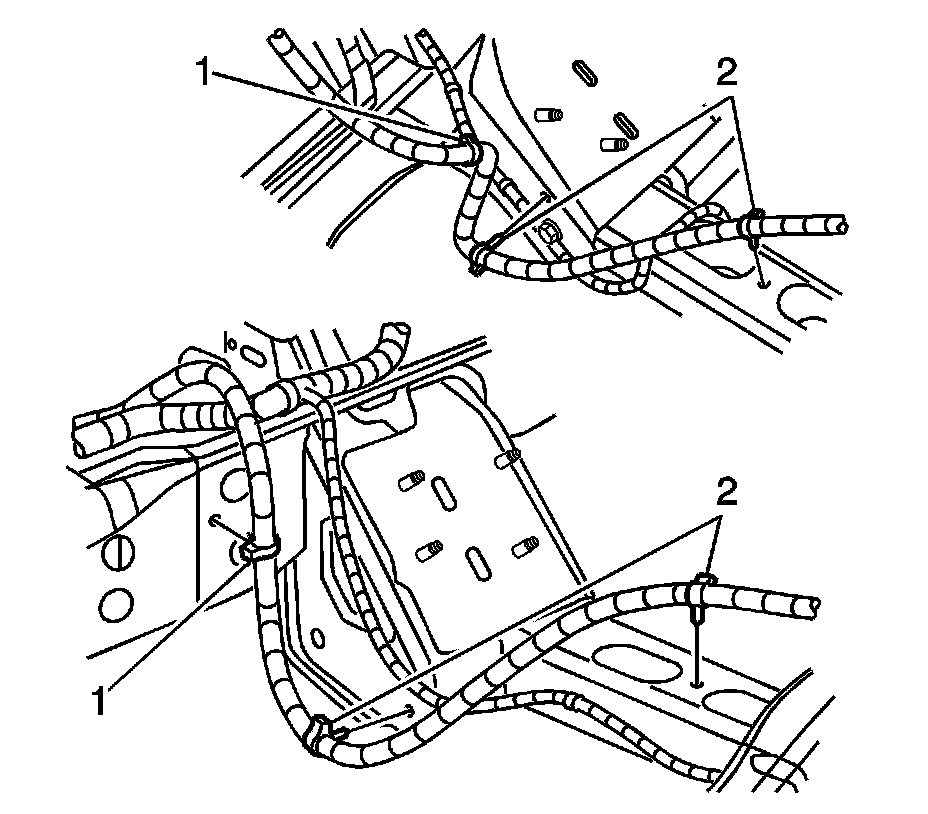 11. Remove the positive cable to the chassis harness clips (2).
