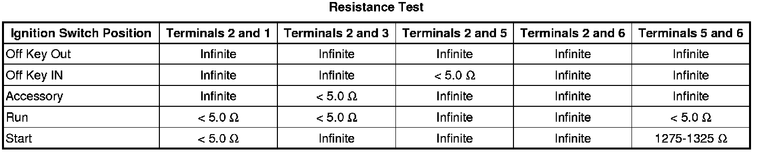 2. Using the Resistance Test table below, check the resistance between the terminals of the ignition switch listed in each switch position.