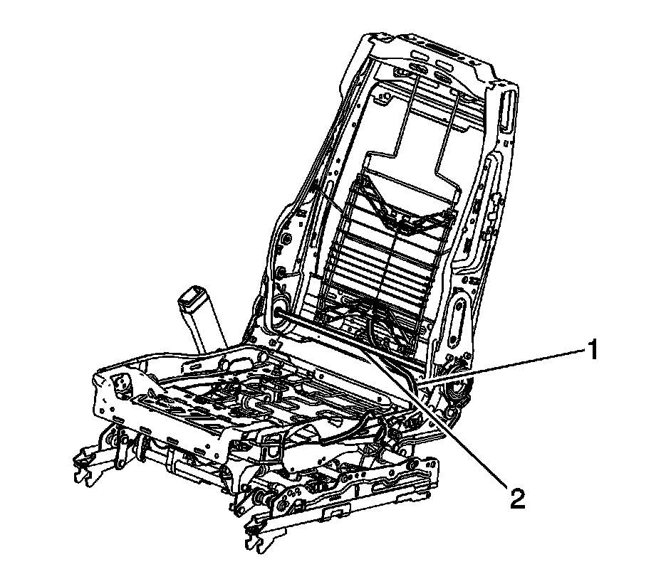 6. Note the routing of the cable for installation purposes, the cable (1) must route between the recliner rod (2) and the seat back frame.