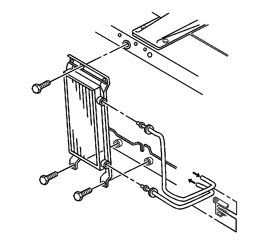 1. Install the inlet and outlet auxiliary transaxle oil cooler hoses to the auxiliary transaxle oil cooler. Refer to Transmission Fluid Cooler Hose/Pipe Quick-Connect Fitting Disconnection and Connection (Service and Repair).