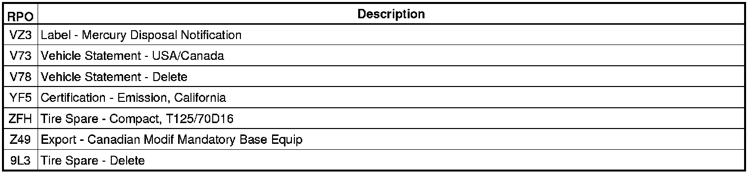 The following table provides the description of the Regular Production Option (RPO) codes that are available on the vehicle. The vehicle's RPO list is printed on the Service Parts Identification Label.
