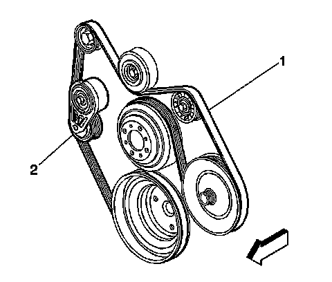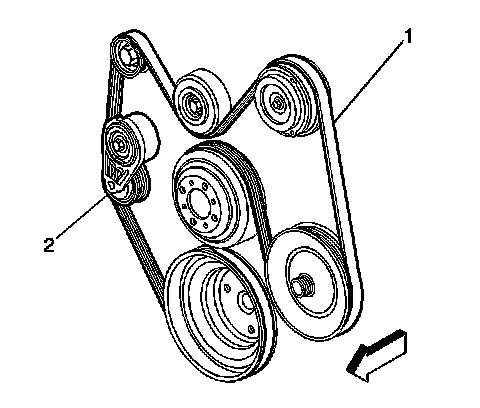 3. Rotate the belt tensioner (2) counterclockwise in order to relieve the tension on the tensioner.