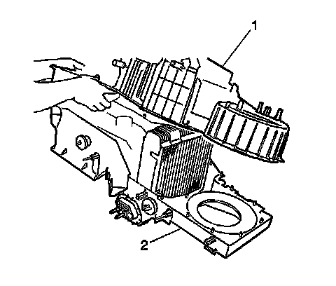 2. Install the upper HVAC module assembly (2) from the lower HVAC module assembly (1)