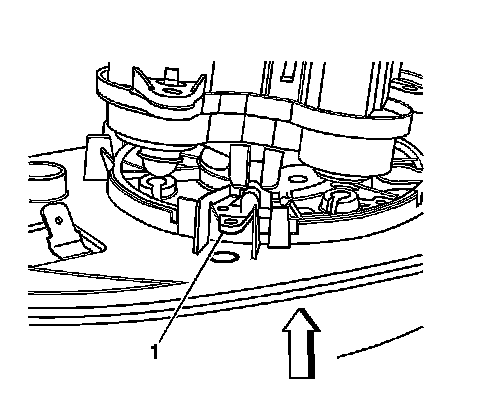 2. Using a flat-bladed tool, carefully release the upper tab (1) that retains the glass to the actuator while simultaneously tilting the glass away from the mirror housing.