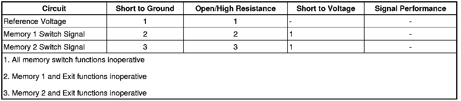 Reference voltage is supplied to the memory seat switch from the driver door module (DDM). When the memory 1 or memory 2 switch is pressed, reference voltage is applied through the switch contacts and the appropriate memory switch signal circuit to the DDM. The door module then sends a serial data message to the memory seat module (MSM) indicating the memory recall request. The MSM then commands the appropriate seat motors to move to the pre-recorded seat positions stored in memory in response to the switch input. When the memory Exit switch is pressed, reference voltage is applied through both, the memory 1 and memory 2 switch signal circuits to the DDM. The door module then sends a serial data message to the MSM indicating the memory Exit request. The MSM then commands the appropriate seat motors to move to the pre-recorded seat exit positions stored in memory.