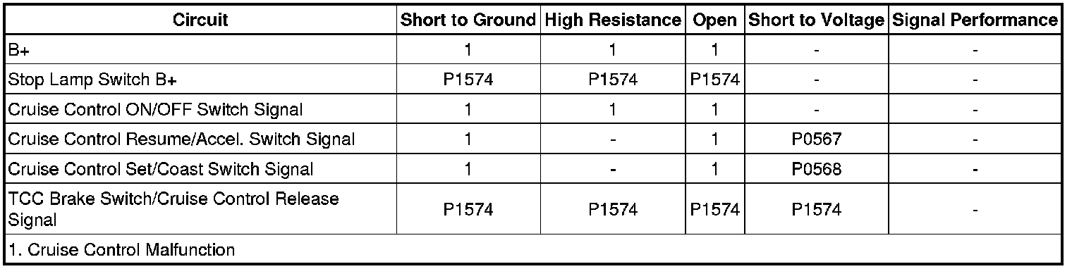 The cruise control switch is an input to the engine control module (ECM). The ECM monitors the cruise control switch signal circuits in order to detect when a cruise control function switch has been activated. The ECM detects a voltage signal when a cruise control function switch is applied.