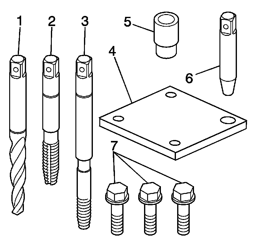 * The use of a cutting type fluid GM P/N 1052864, Canadian P/N 992881, WD 40(R) or equivalent is recommended when performing the drilling, counterboring and tapping procedures.