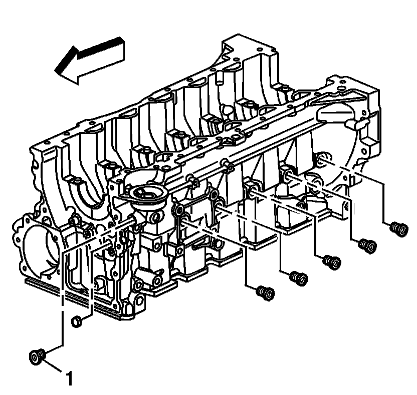 2. Tighten the front (1) engine block oil gallery plug to 80 Nm (40 lb ft).