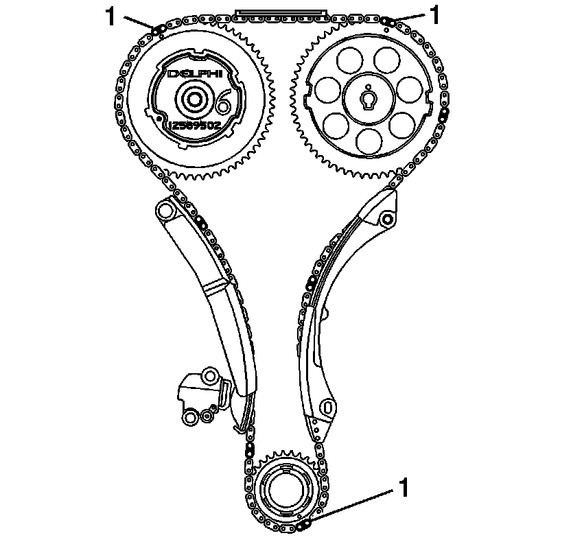 14. Align the dark link of the timing chain with the timing mark on the exhaust camshaft actuator (1).