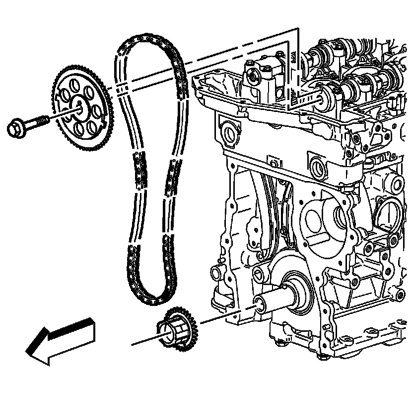 7. Install the intake camshaft sprocket into the timing chain. Refer to Camshaft Position Actuator Diagnosis (Component Tests and General Diagnostics).