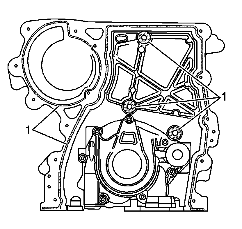 2. Apply a 3 mm (0.12 in) bead of sealer to the trace grooves on back side of the engine front cover (1). Refer to Adhesives, Fluids, Lubricants, and Sealers (Specifications) for the correct part number.
