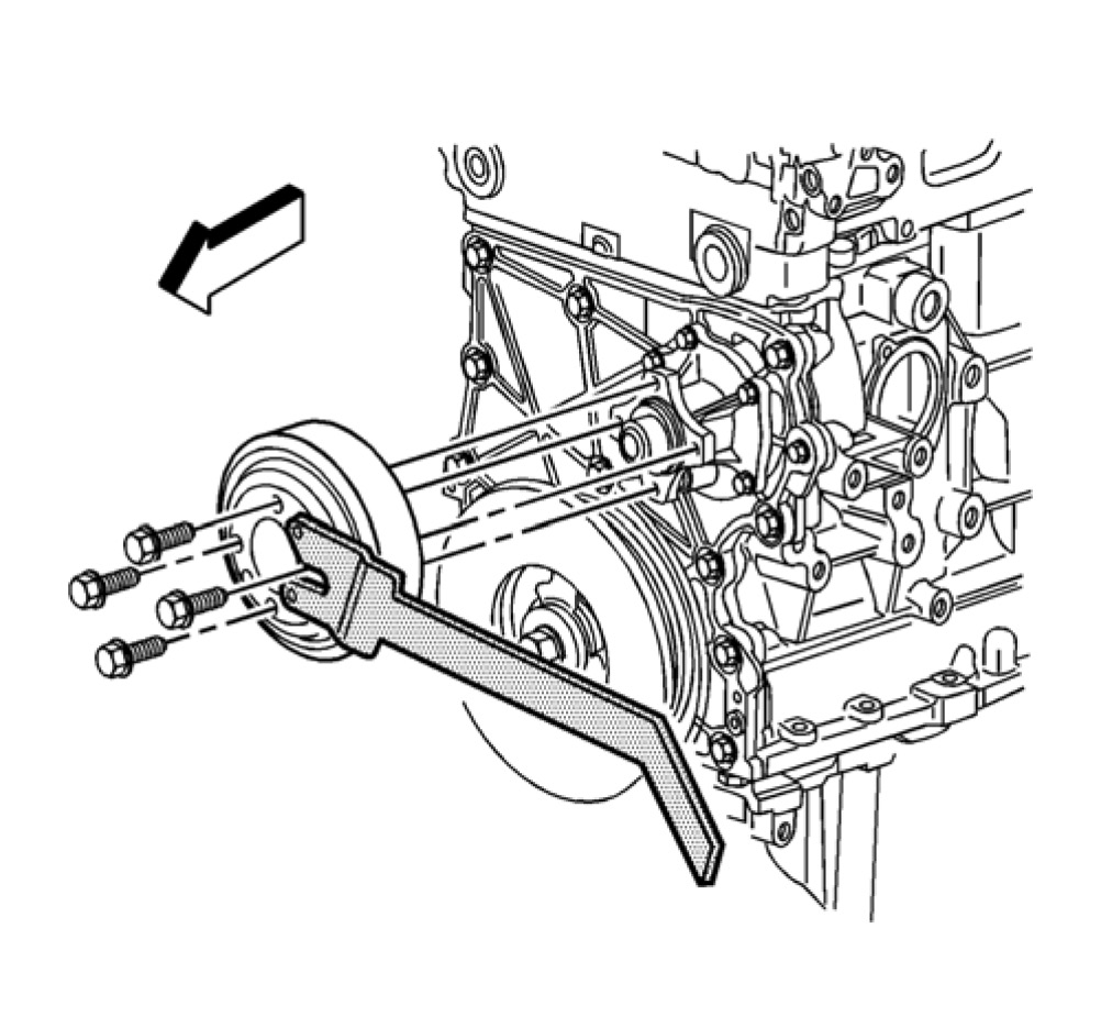 5. Using the J 41240, secure the water pump pulley while tightening the water pump pulley bolts and tighten to 25 Nm (18 lb ft).