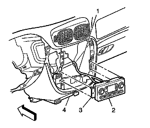 3. Depress the HVAC control module retaining tabs (3) and remove the HVAC control module (2) from the instrument panel (4).