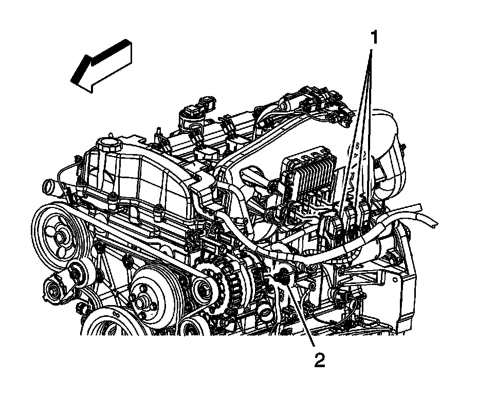 1. Remove the ECM bracket nuts (1) and bolts (2).