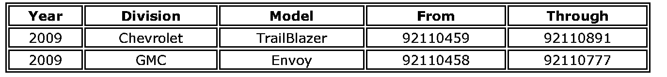 Involved are certain 2009 model year Chevrolet Trailblazer and GMC Envoy model vehicles equipped with a 4.2L inline 6 Cylinder (RPO LL8 - VIN S) engine and built within the VIN breakpoints shown above.
