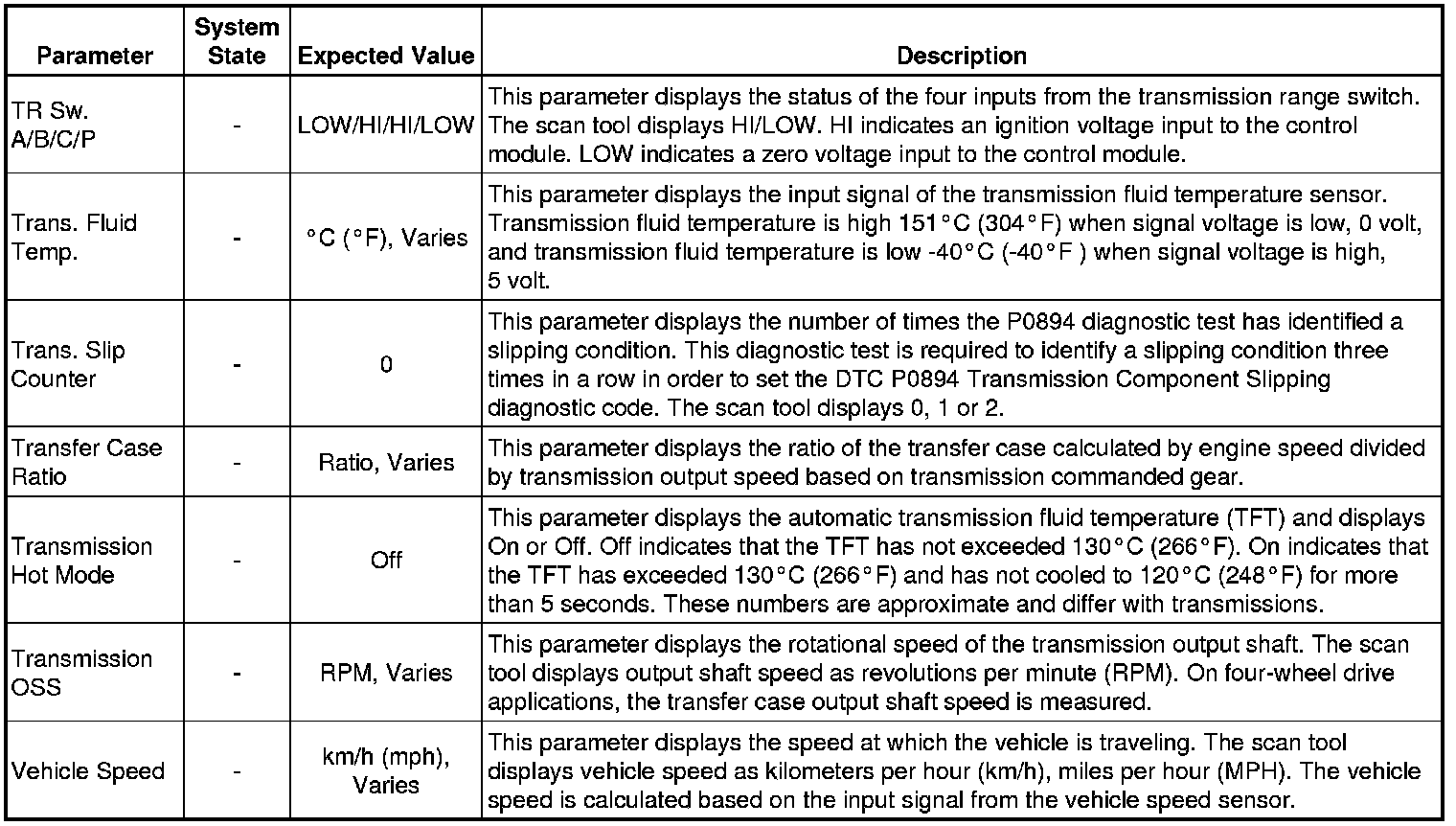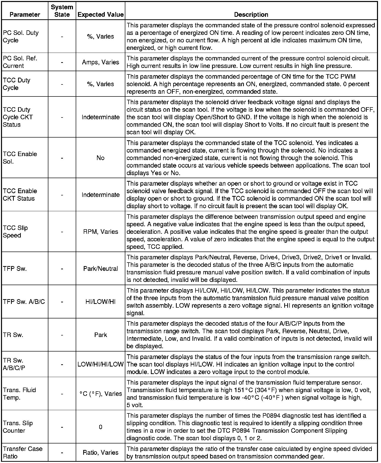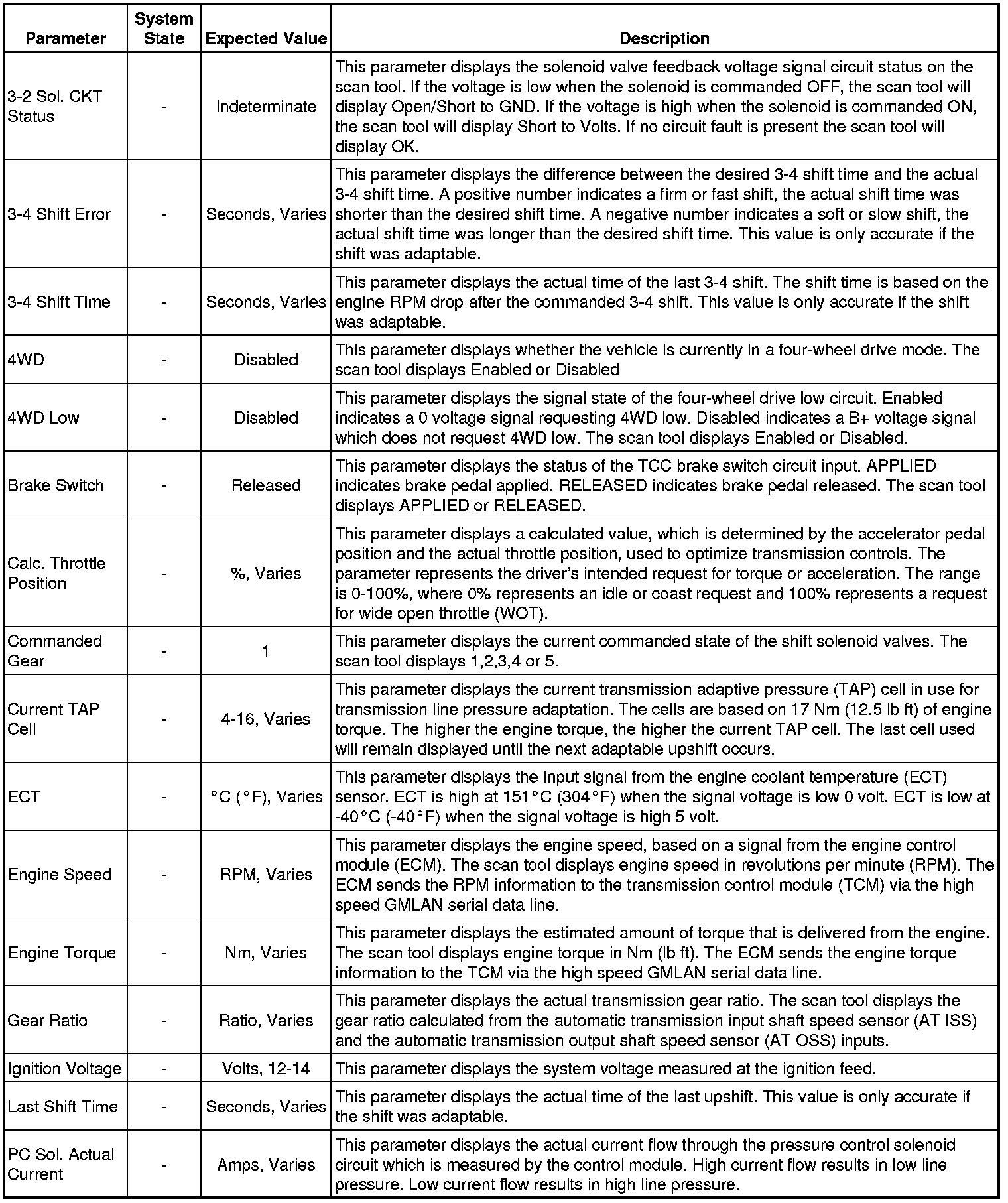 The Transmission Control Module Scan Tool Data List contains all transmission related parameters that are available on the scan tool. The list is arranged in alphabetical order. A given parameter may appear in any one of the data lists, and in some cases may appear more than once, or in more than one data list in order to group certain related parameters together.