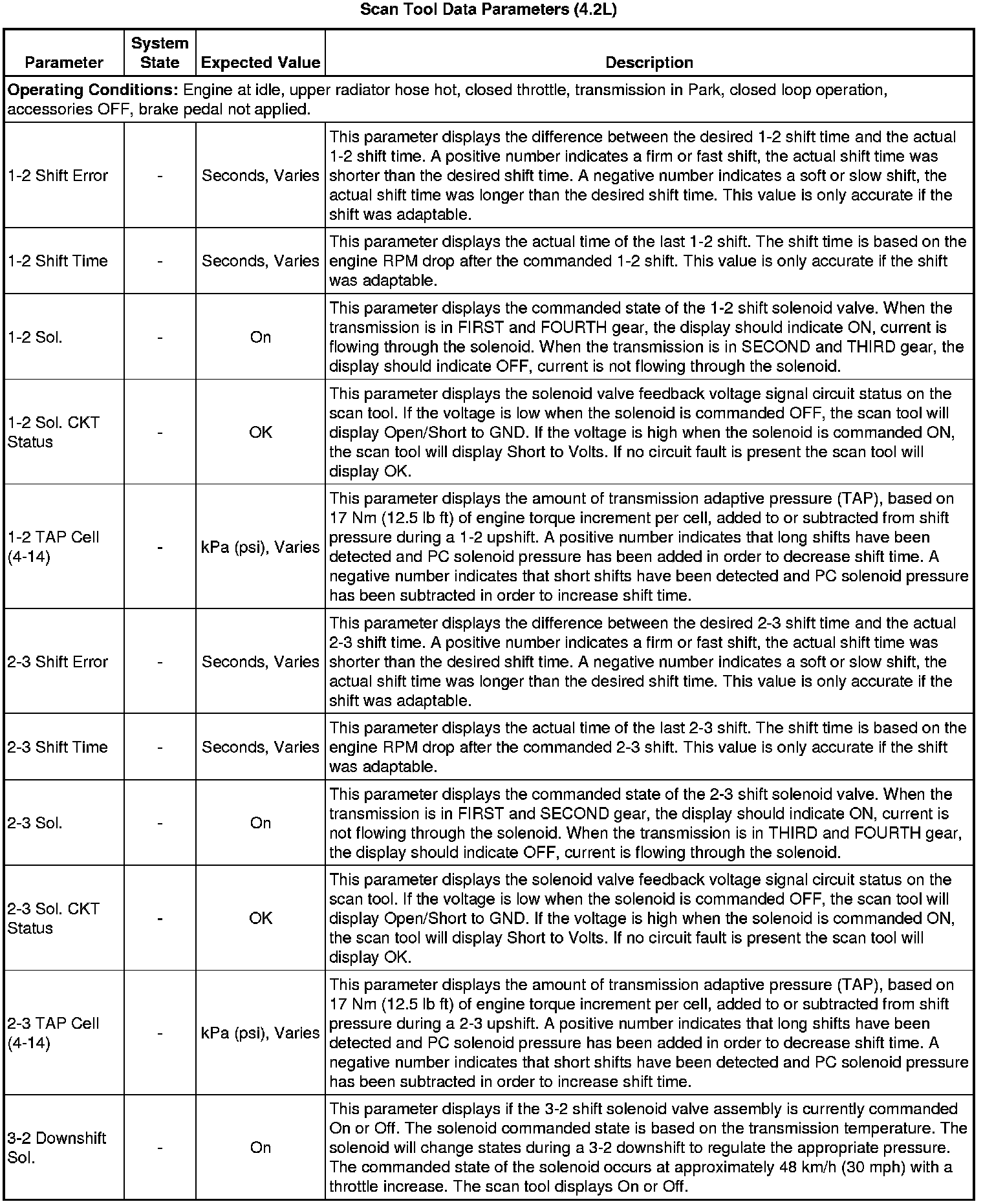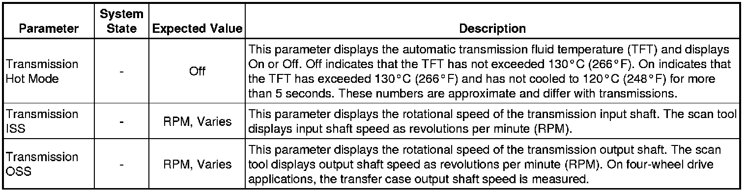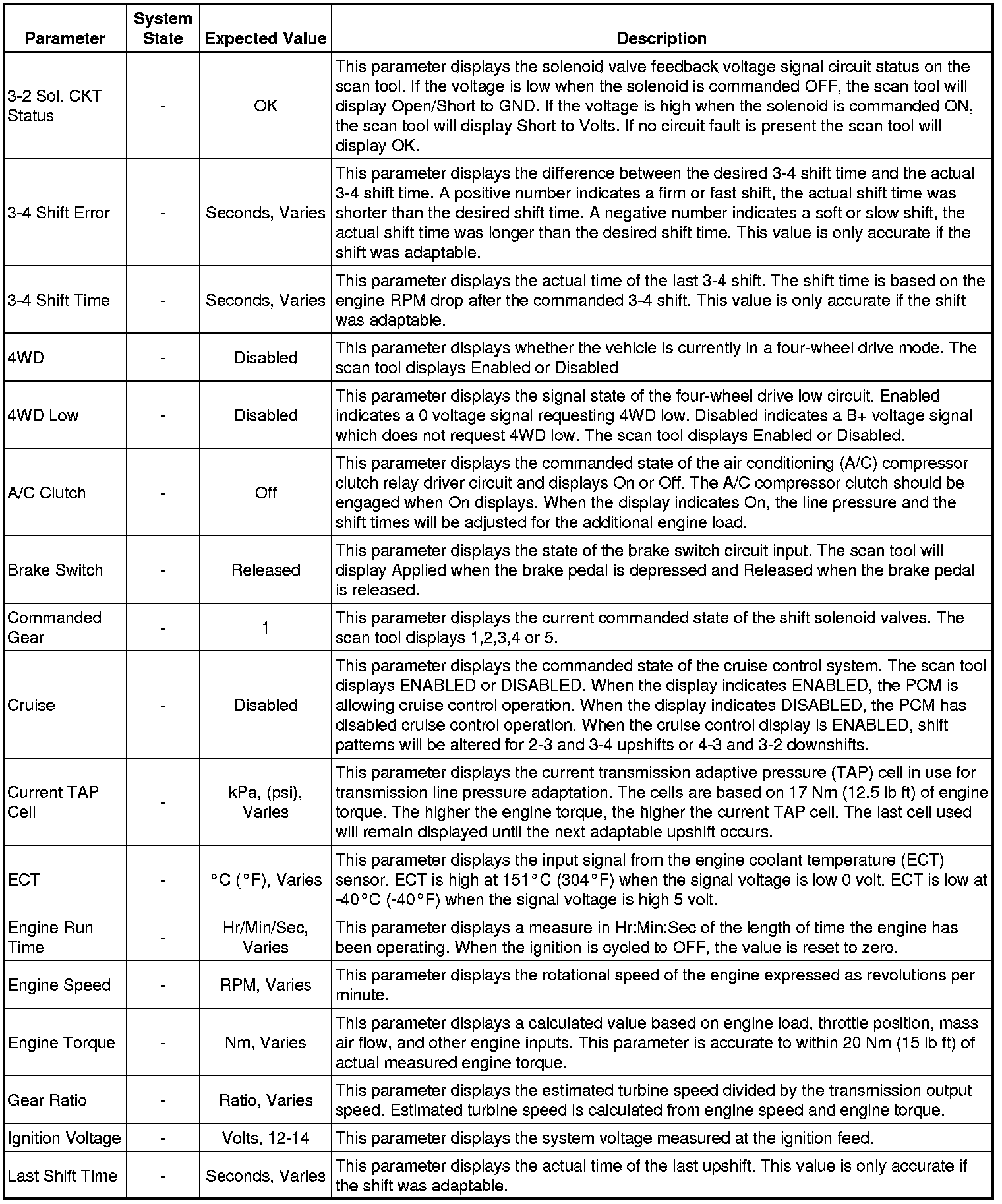 The Transmission Control Module Scan Tool Data List contains all transmission related parameters that are available on the scan tool. The list is arranged in alphabetical order. A given parameter may appear in any one of the data lists, and in some cases may appear more than once, or in more than one data list in order to group certain related parameters together.
