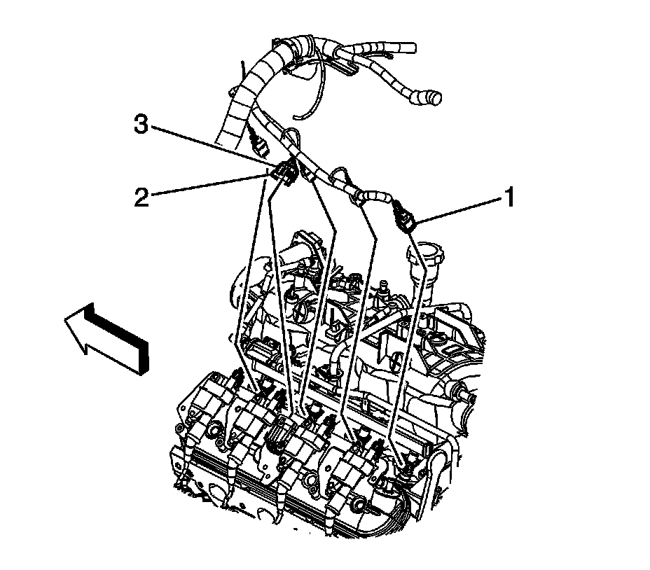 19. Install the left side CPA retainer (3) to the engine wiring harness main ignition coil electrical connector.