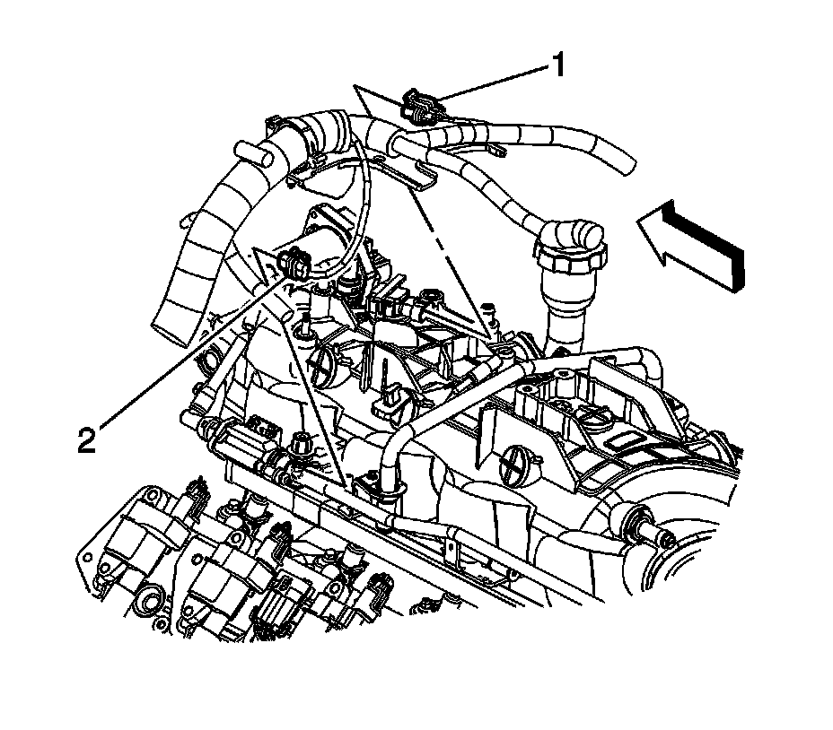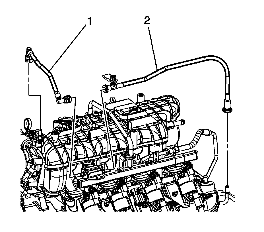 18. Remove the EVAP purge solenoid vent tubes (1, 2). Refer to Plastic Collar Quick Connect Fitting Service (Plastic Collar Quick Connect Fitting Service).