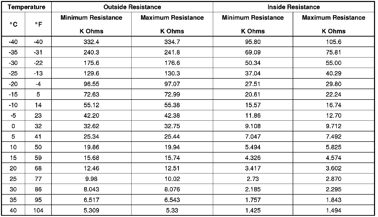 Sensor Resistance Table