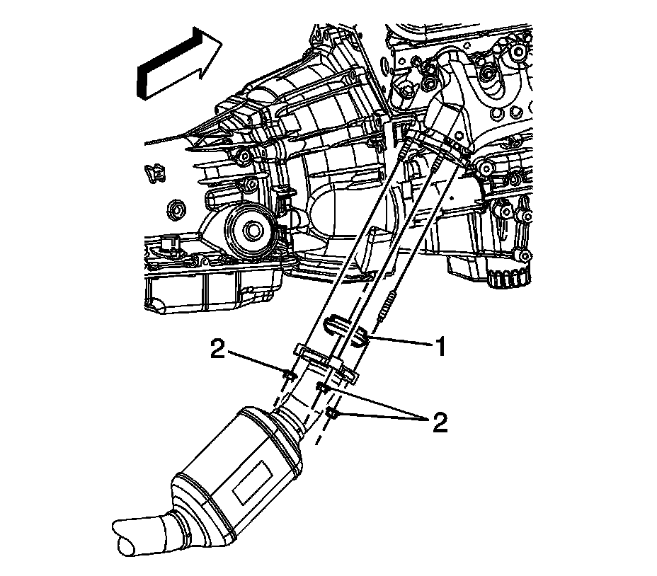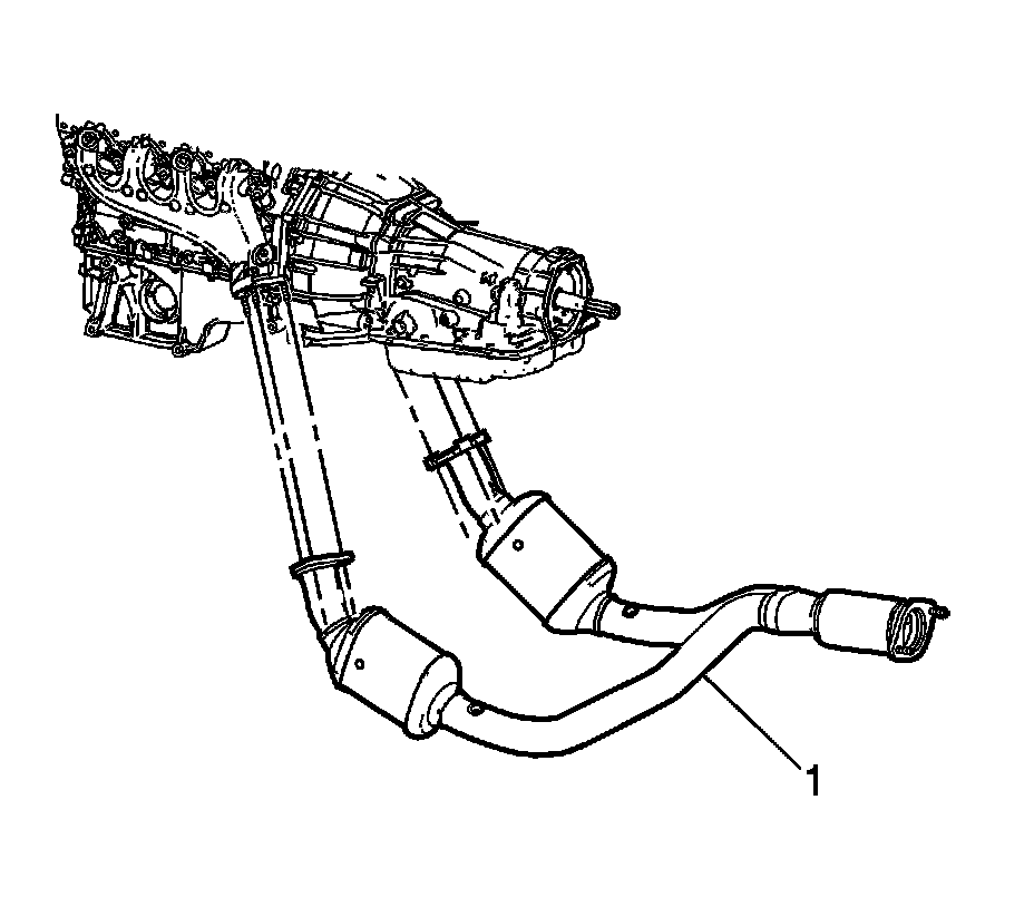 13. Tilt the catalytic converter in order to lower the left side pipe below the vehicle frame. Rotate the catalytic converter outlet pipe toward the left side of the vehicle to gain the necessary clearance for the right side pipe to clear the vehicle frame. Remove the catalytic converter (1) from the vehicle.