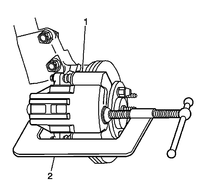 3. Install a C-clamp (2) over the body of the brake caliper, with the C-clamp ends against the rear of the caliper body and the outboard disc brake pad.