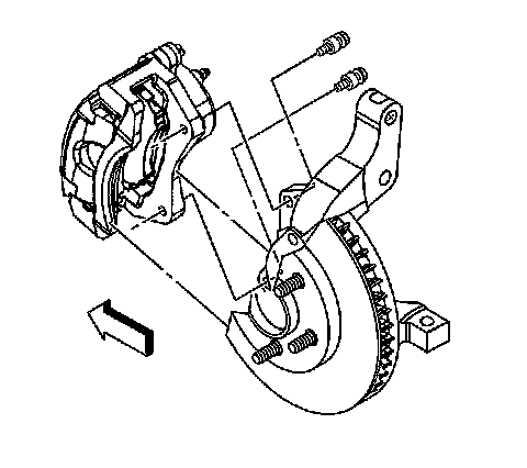 9. Install the brake caliper and the brake caliper bracket as an assembly to the suspension knuckle. Refer toFront Brake Caliper Bracket Replacement Front Brake Caliper Bracket Replacement.