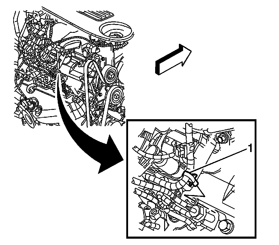 124. Position the coolant recovery reservoir hose clamp (1) at the coolant crossover.
