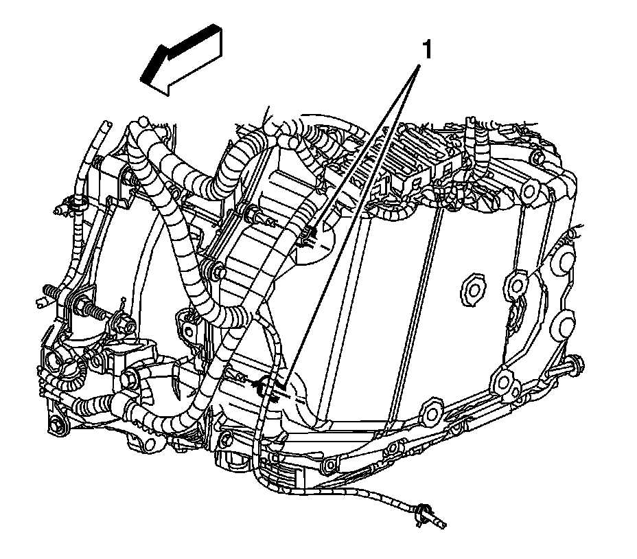 16. Install the engine harness clips (1) to the transaxle studs.