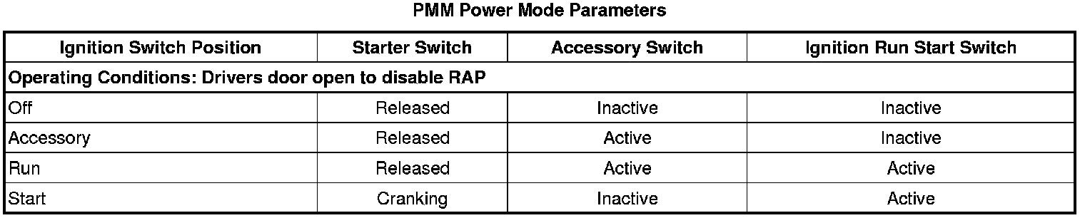 With a scan tool, access BCM, Power Mode data display list and compare all parameters listed with the corresponding ignition key position. The PMM Power Mode Parameters table below illustrates the correct state of these input parameters in correspondence to the ignition switch position.