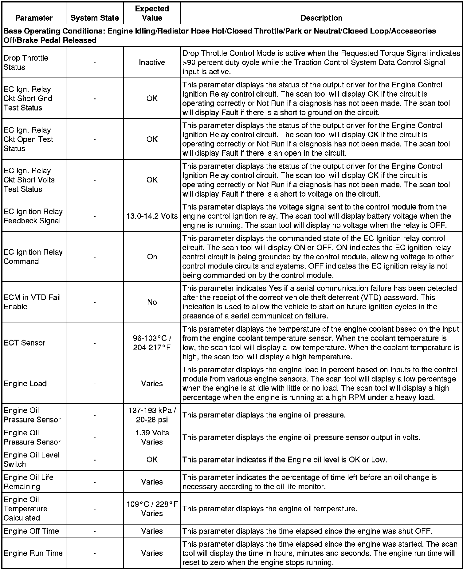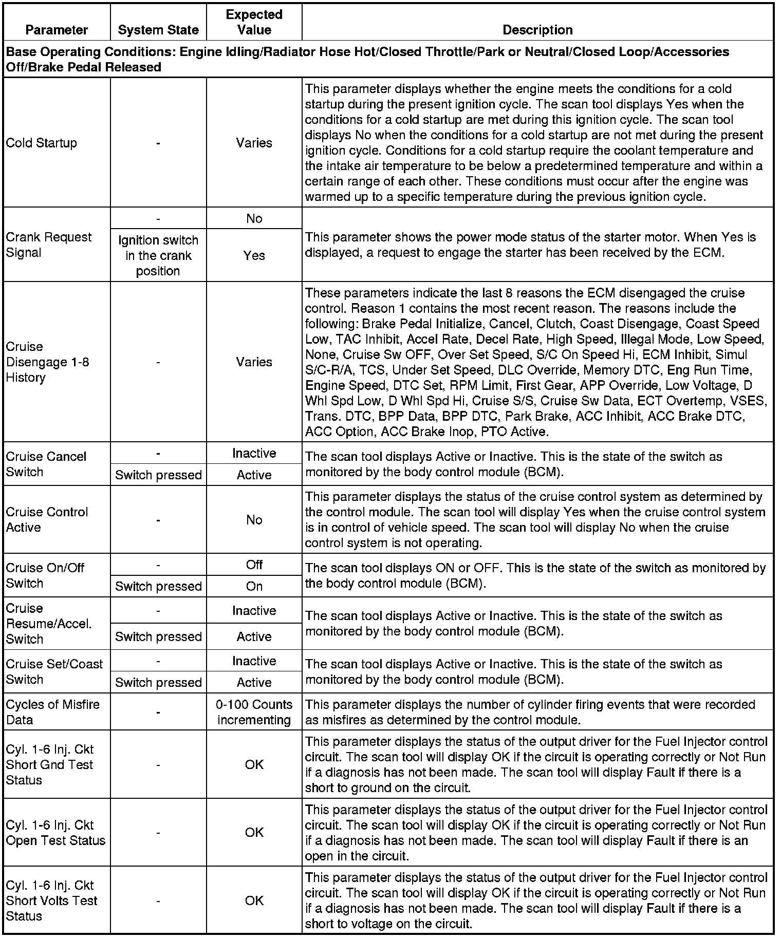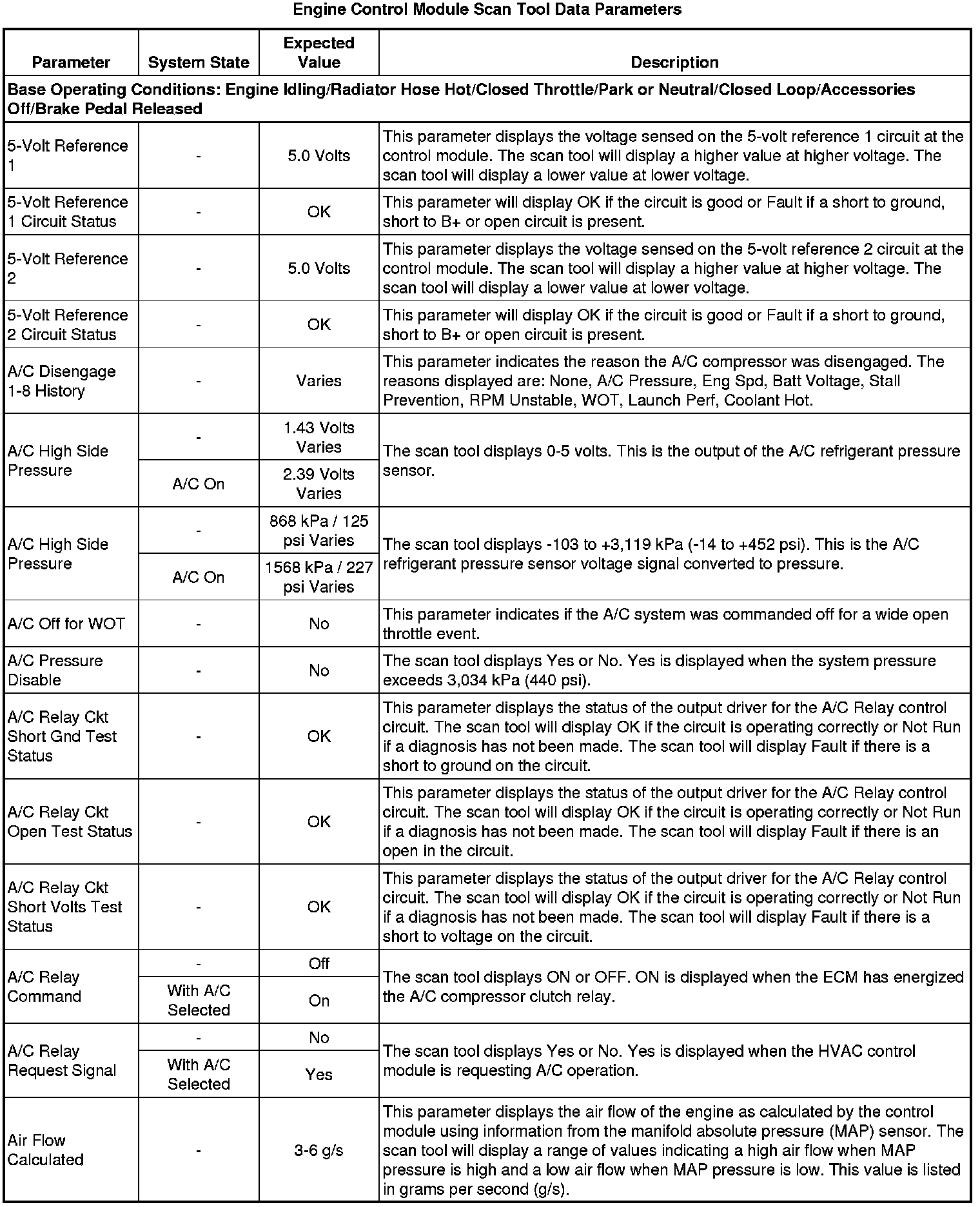 The Engine Control Module Scan Tool Data List contains all engine-related parameters that are available on the scan tool. The list is arranged in alphabetical order. A given parameter may appear in any one of the data lists, and in some cases may appear more than once, or in more than one data list in order to group certain related parameters together.