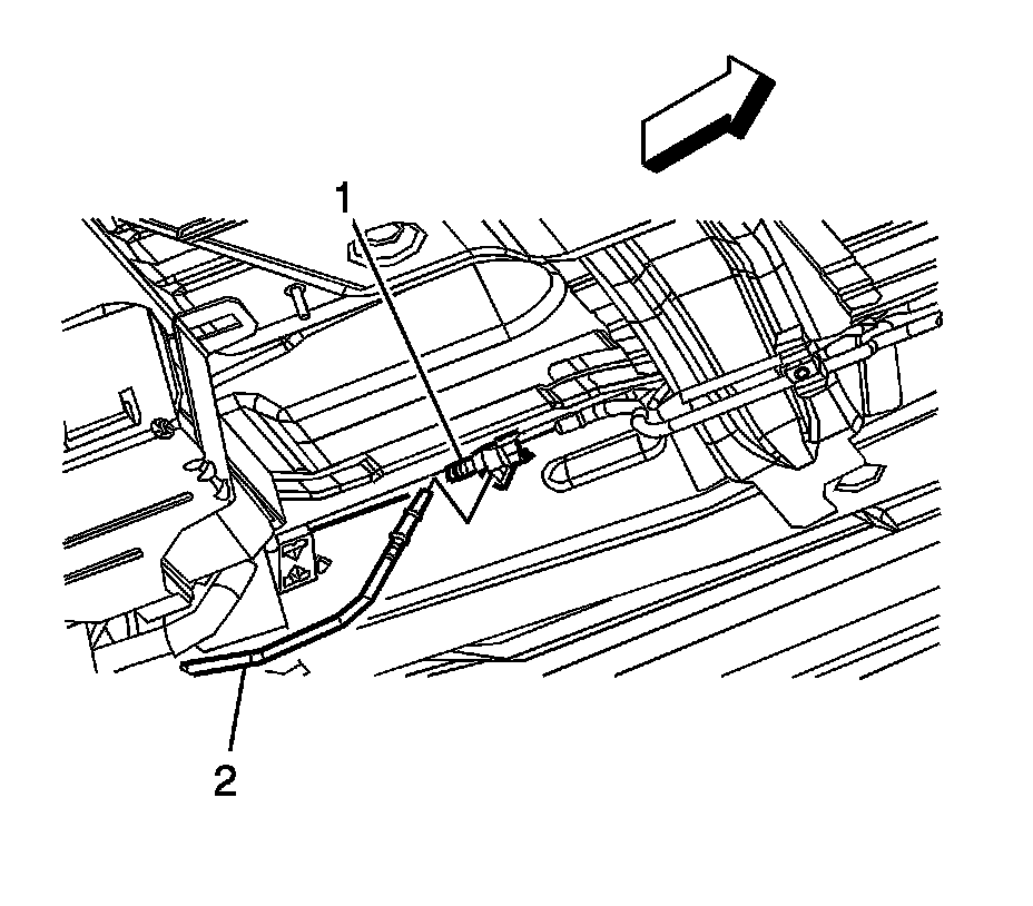 2. Disconnect the fuel feed (1) and evaporative emission (EVAP) (2) pipes from the fuel tank. Refer to Plastic Collar Quick Connect Fitting Service Plastic Collar Quick Connect Fitting Service.