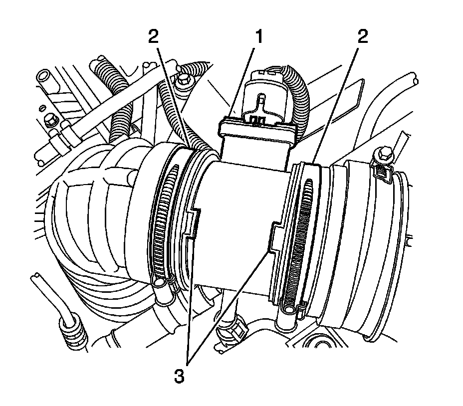 Note: Ensure the mass airflow sensor is installed correctly. The arrow indicates direction of airflow and the tabs of the hoses and notches (3) of the sensor must be aligned as illustrated. Failure to do so may cause driveablity concerns and DTC's.
