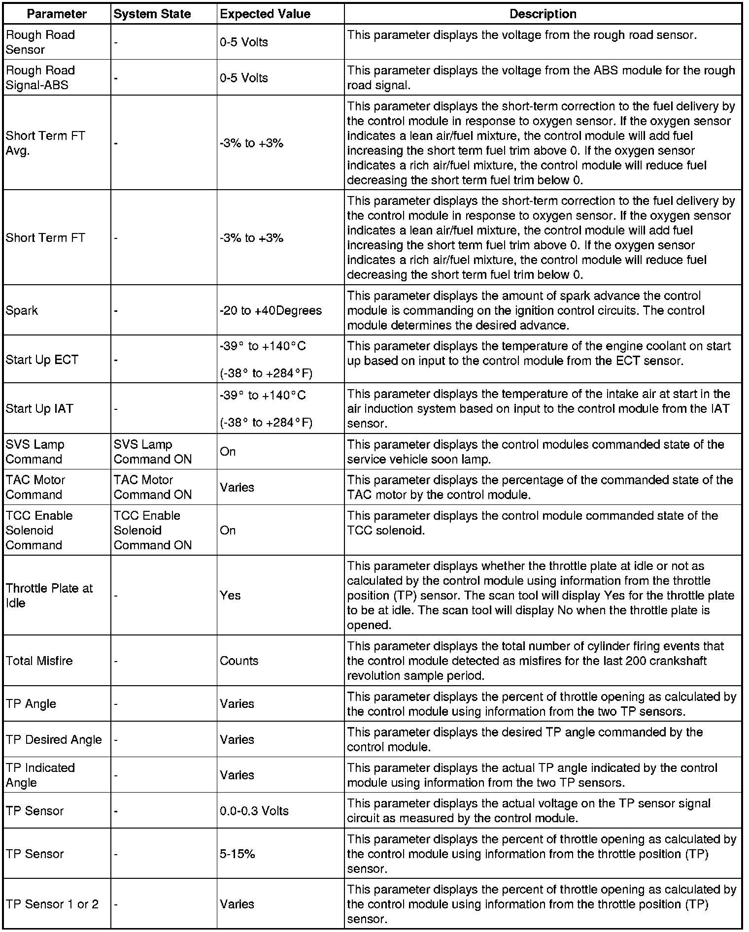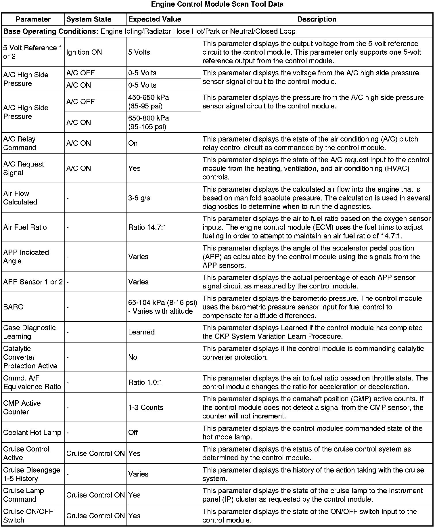 The scan tool values from a properly running engine may be used for comparison with the engine you are diagnosing. The Engine Scan Tool Data List represents values that would be seen on a normally running engine.