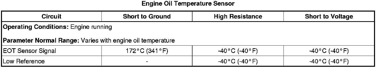 The engine oil temperature (EOT) sensor is a variable resistor that measures the temperature of the engine oil. The engine control module (ECM) supplies 5 volts on the EOT signal circuit, and a ground to the low reference circuit.