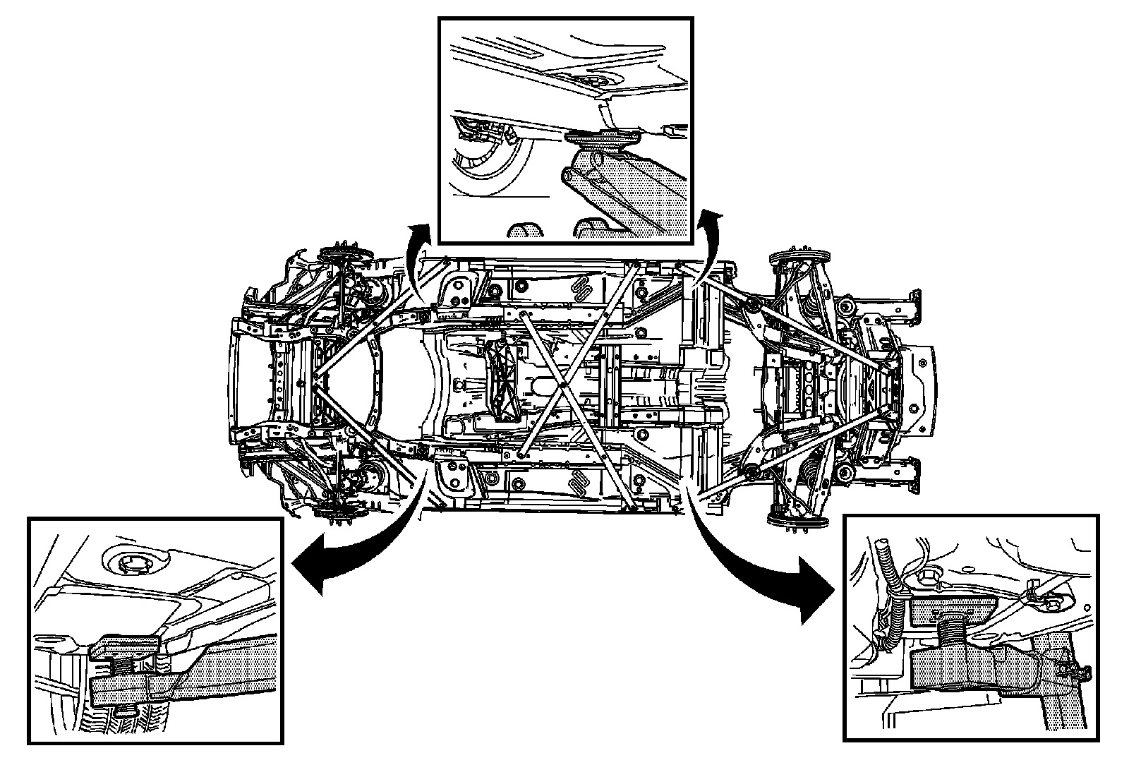 Caution: When you are jacking the vehicle at the front locations, be certain that the jack or the jack lift pad does not contact the front fascia, front fascia air dam, or the front fenders. If such contact occurs, vehicle damage may result. When jacking at selected front locations additional clearance may be required for the jacking points.