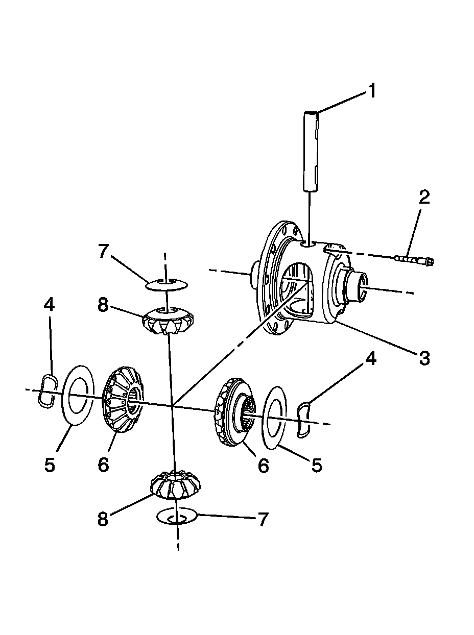 7. Remove the differential pinion gears (8) and the thrust washers (7) from the differential case (3).
