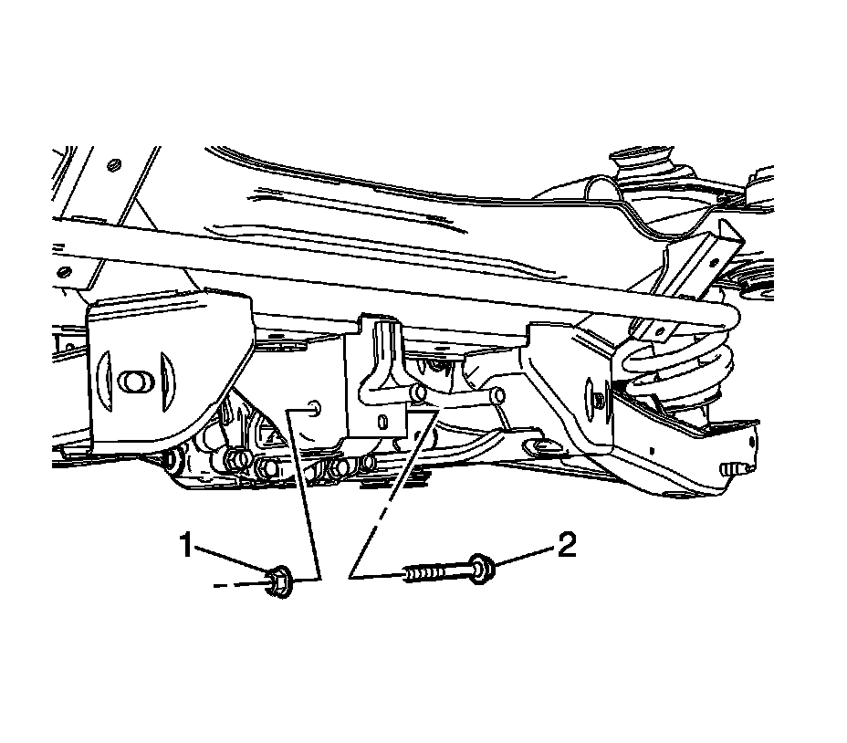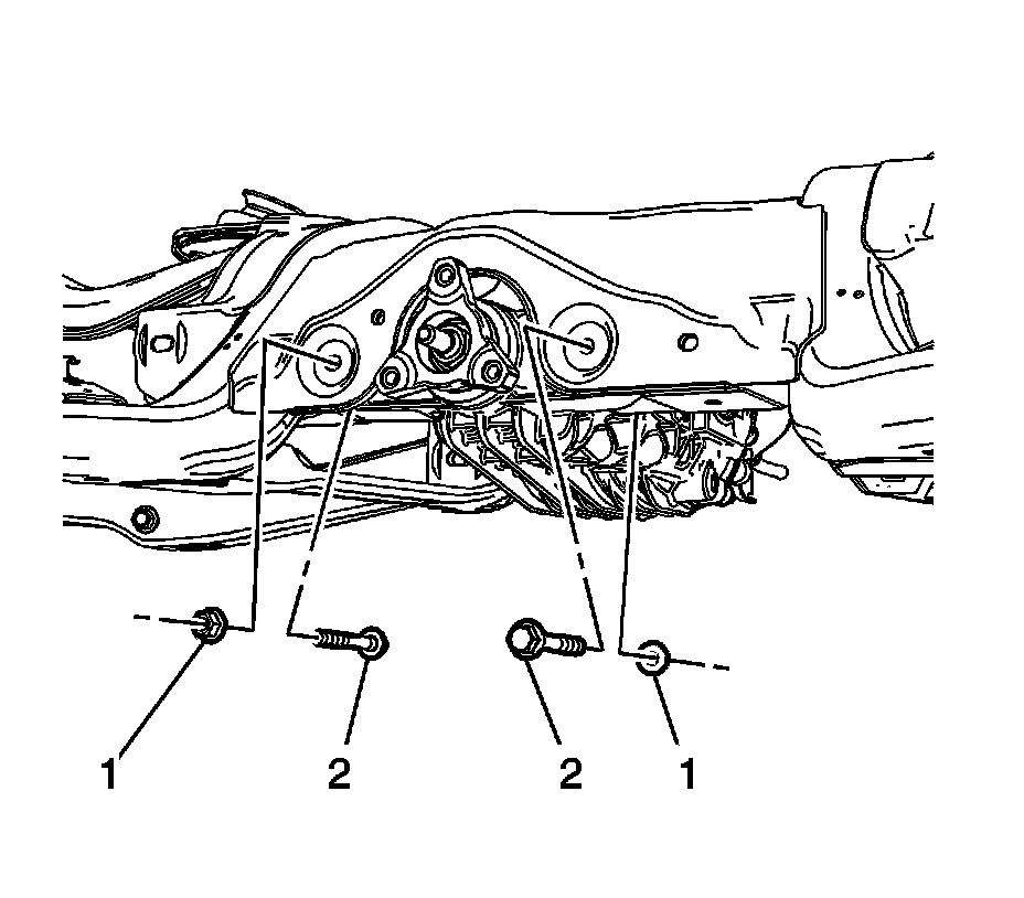 4. Install the rear differential mounting nut (1) and bolt (2).