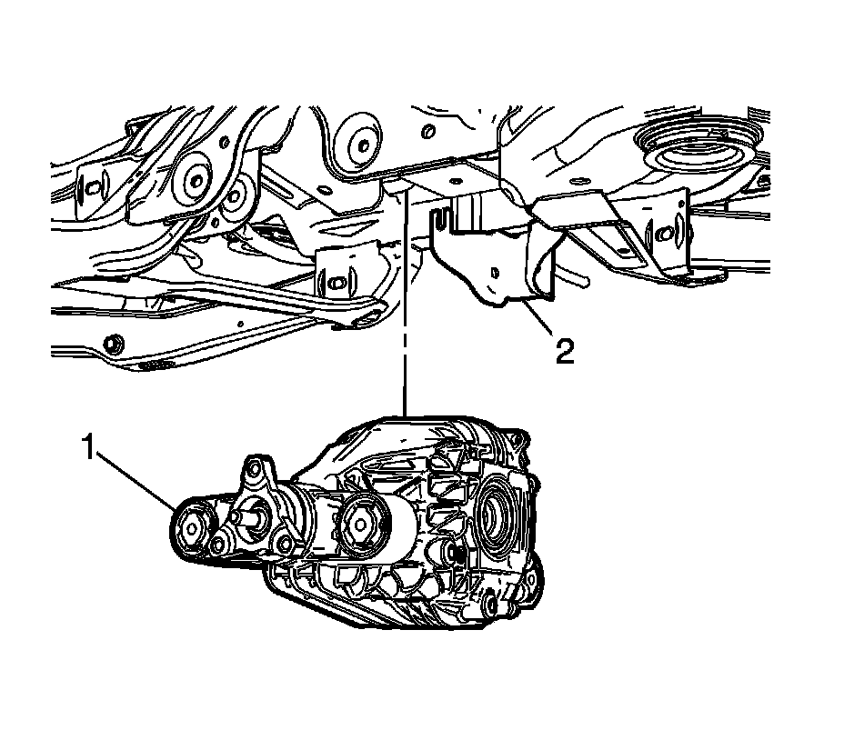 1. Position the rear differential assembly (1) in the rear suspension carrier (2).
