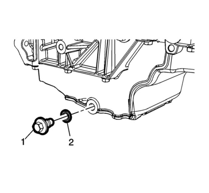12. Install the oil pan drain plug (1) and NEW O-ring seal (2) and tighten to 20 Nm (15 lb ft).