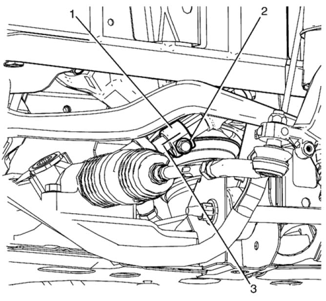 21. Working under the vehicle, use paint in order to place match marks on the intermediate steering shaft (1) and on the steering gear pinion shaft (3).