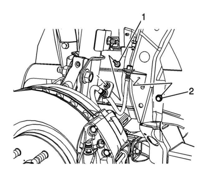 14. Install the brake hose bracket bolt (2) to the wheelhouse panel and tighten to 9 Nm (80 lb in).