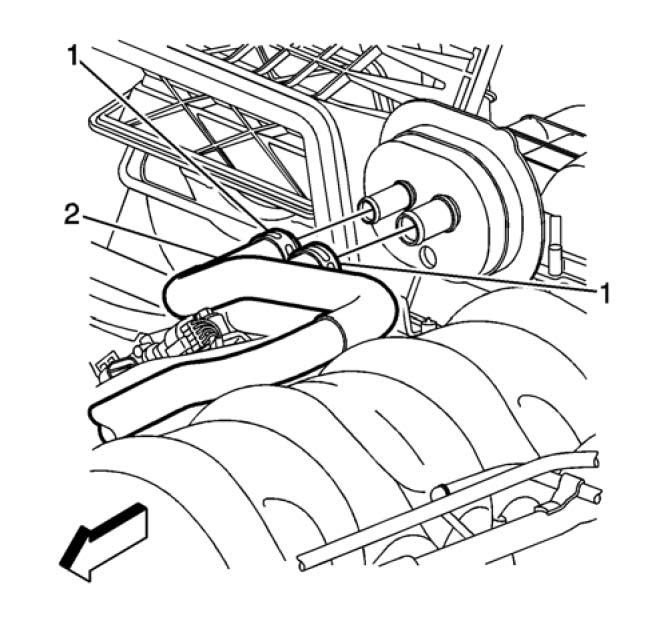 18. Remove the heater inlet rear and outlet hose (2) from the heater core.