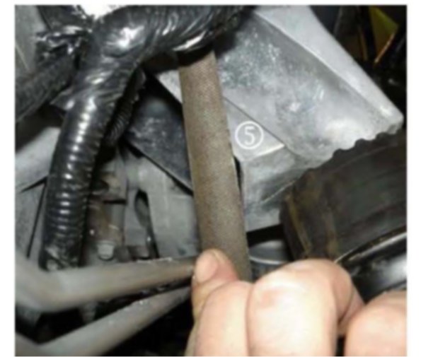 7. Use a hand file to round the edge of the motor mount (5) in the battery positive starter cable-to-motor mount contact area.