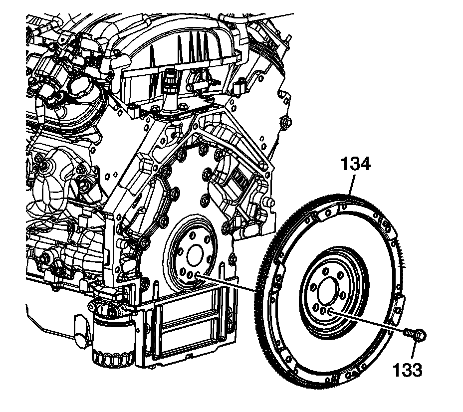 1. Install the engine flywheel bolts (133) and the flywheel (134). Refer to Engine Flywheel Installation (107. Engine Flywheel Installation)