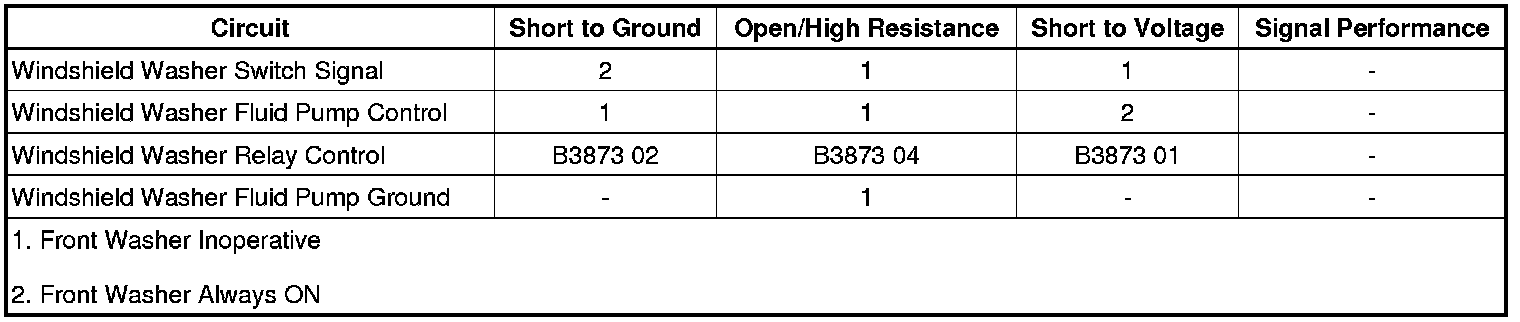 The body control module (BCM) controls the windshield washer fluid pump based on an input from the wiper/washer switch. The BCM monitors the washer switch through the wiper/washer switch signal circuit. When the wash switch is closed, ground is supplied to the windshield washer switch signal circuit. When this is the case, the BCM will command the windshield washer fluid pump and the low speed wipers on.