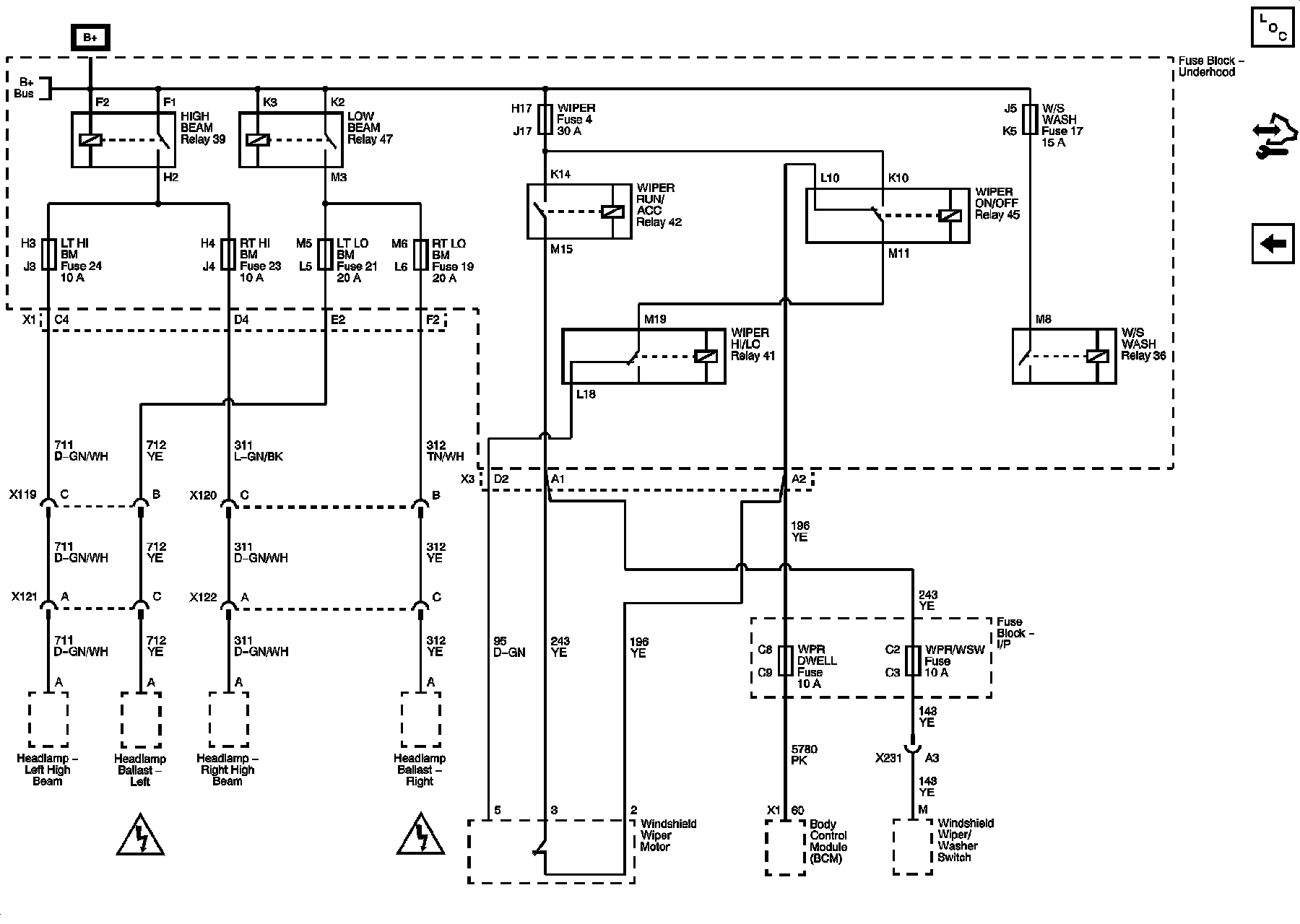 LT HI BM, LT LO BM, RT HI BM, RT LO BM, WIPER, WPR DWELL, WPR/WSW, and W/S WASH Fuses