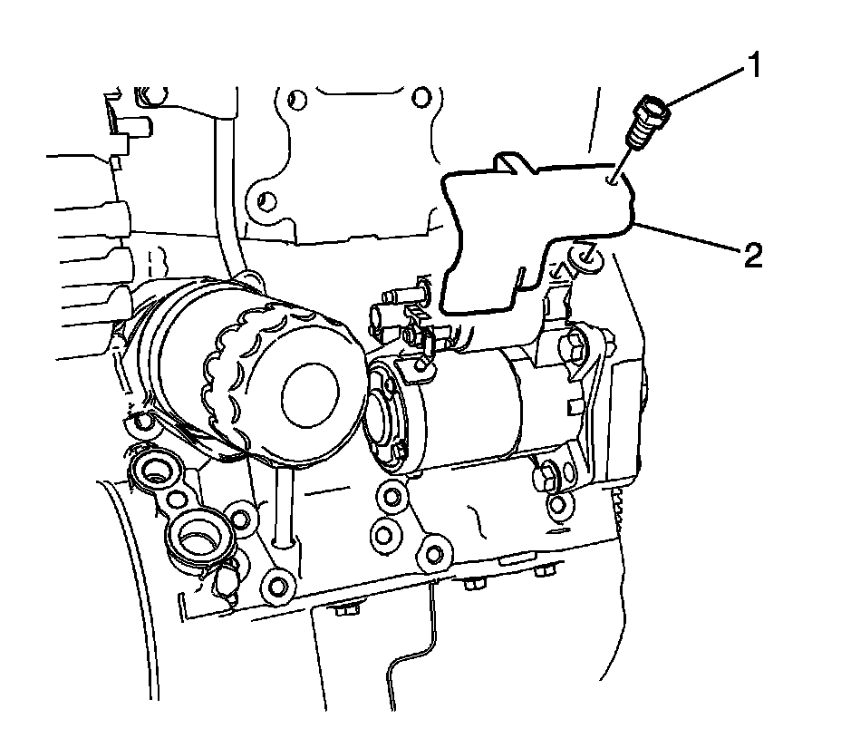 5. Install the starter heat shield (2) and tighten the bolt (1) to 7 Nm (62 lb in).