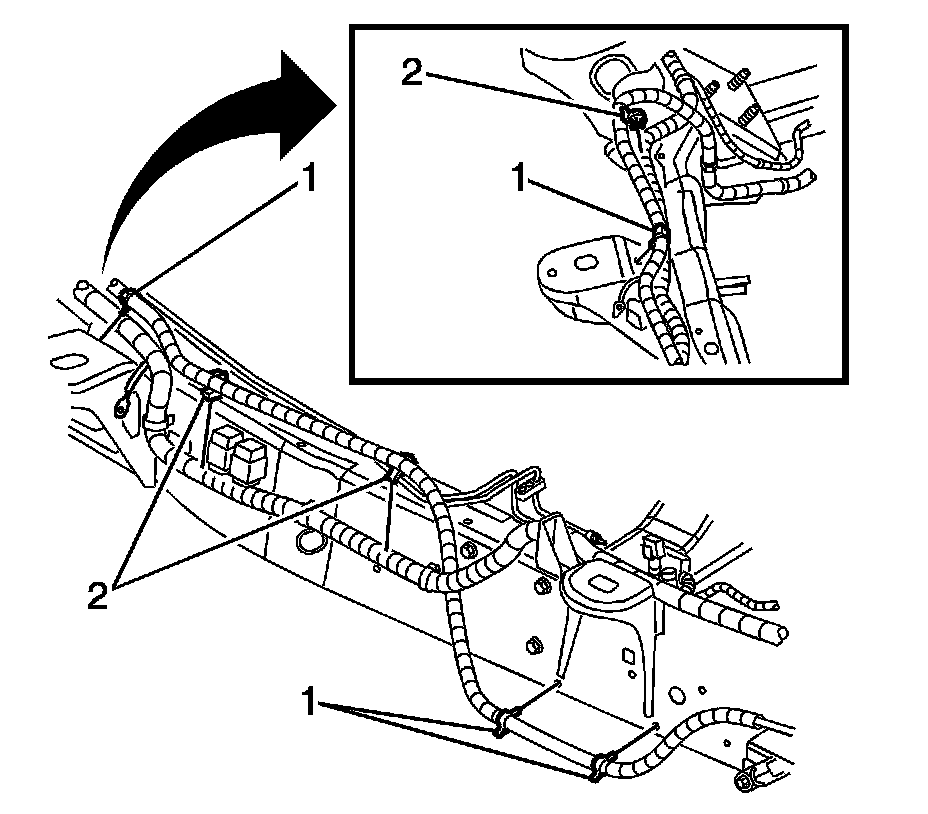 11. On models equipped with 4.8L, 5.3L or 6.0L engine, clip battery positive cable to the engine harness retainer (2).